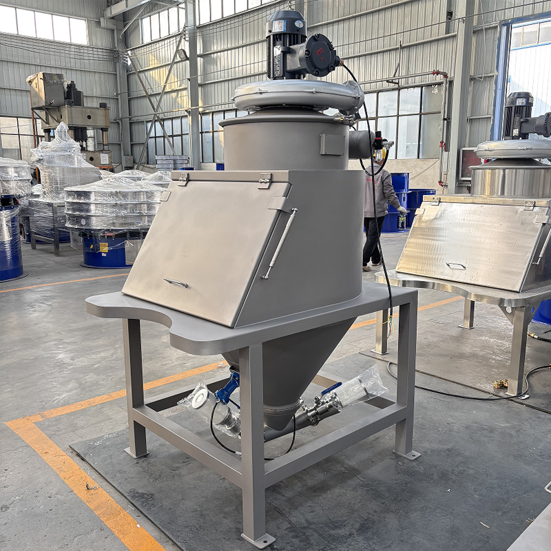 The dust-free feeding station achieves clean and efficient powder and granular material feeding through a core design of enclosure, negative pressure, and filtration. Its operation begins in a sealed chamber where the materials are fed in, effectively preventing dust from escaping at the source. Simultaneously, an internal fan is continuously running, creating a stable micro-negative pressure within the chamber, which can effectively suppress and collect the dust that is raised. The dusty airflow is purified by an efficient filter before being discharged. The intercepted dust is returned to the feeding hopper under the action of the pulse cleaning system, and all the materials are safely transported to the downstream process through the bottom outlet, ensuring the entire process effectively controls dust and maintains the cleanliness of the environment and the materials.