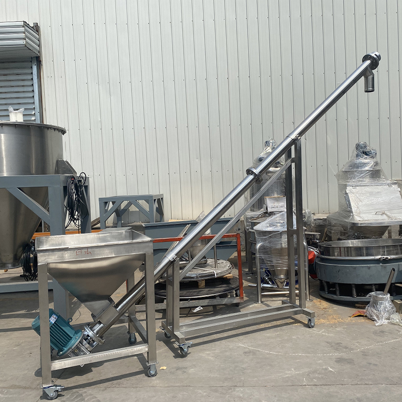 1.Conveyor vít vận chuyển vật liệu hỗn hợp từ máy trộn ruy băng đến một conveyor vít ngang